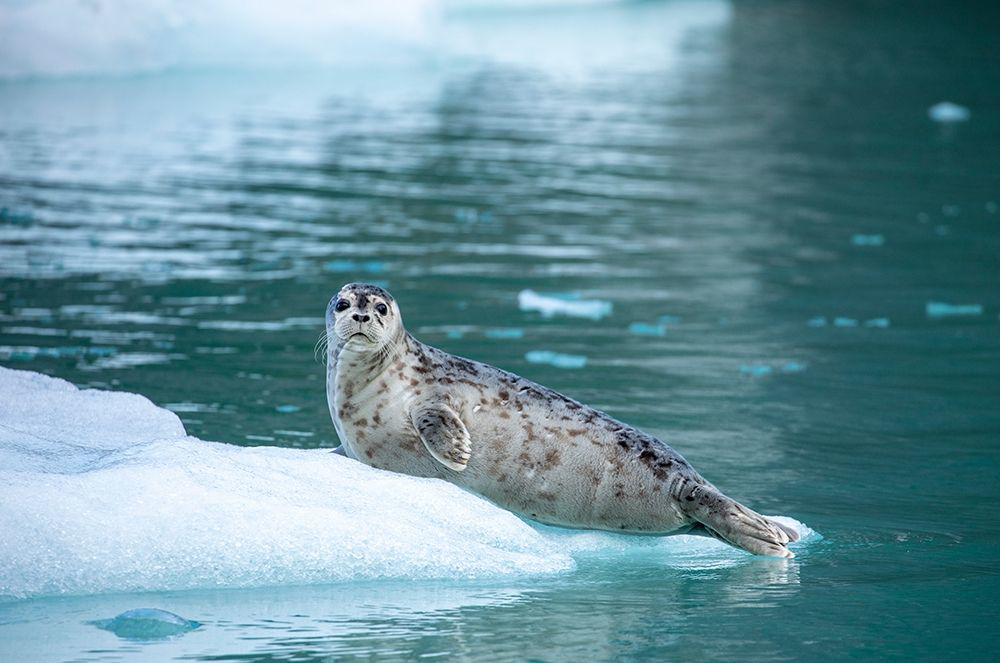 ALASKA-LECONTE BAY-HARBOR SEAL PUP RESTING ON ICEBERG CALVED FROM LECONTE GLACIER EAST OF PETERSBURG
