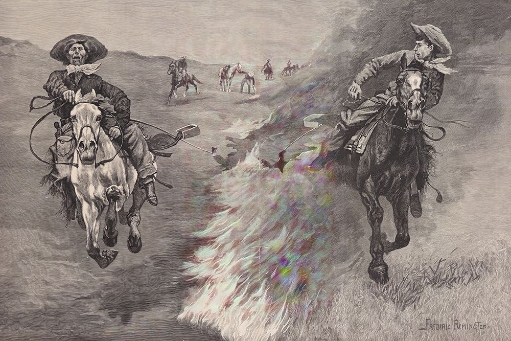 DRAGGING A BULLS HIDE OVER A PRAIRIE FIRE IN NORTHERN TEXAS 1888