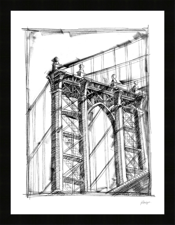 A pencil sketch of the Manhattan Bridge in black and white tones, by Ethan Harper. This high quality fine art print is framed in a 1.5" satin black square edge frame. A beautiful piece of framed artwork that will look great in any home as a focal piece or as a set with another in the Graphic Architectural Study series (sold separately). 27" H x 21" W