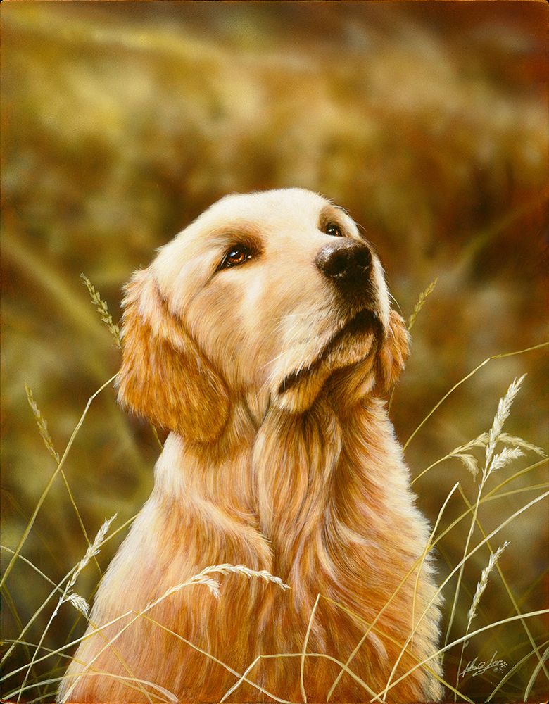 a golden retriever dog in a sitting position looking up