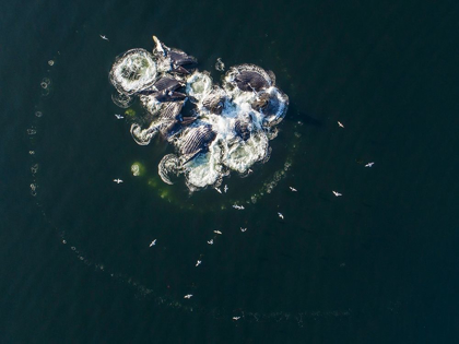ALASKA-AERIAL VIEW OF HUMPBACK WHALES BUBBLE NET FEEDING ON SCHOOL OF HERRING FISH