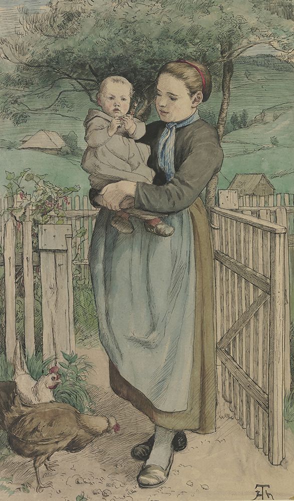 PEASANT GIRL WITH A CHILD IN HER ARMS STANDING AT A WOODEN LATTICE
