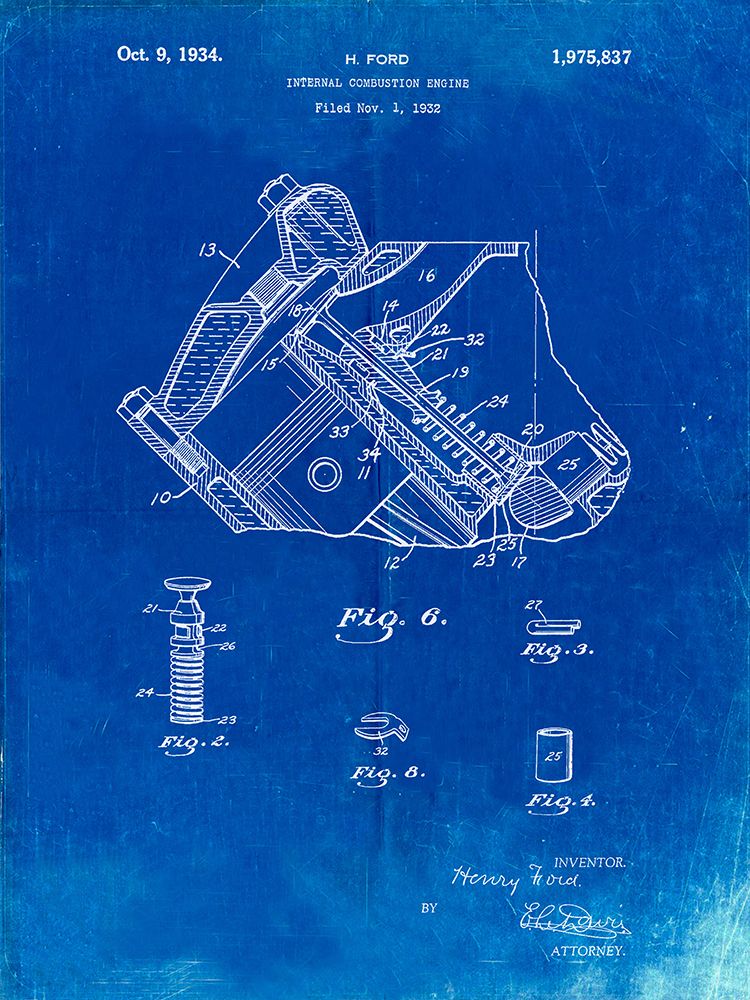pp172- faded blueprint ford v-8 combustion engine 1934 patent poster