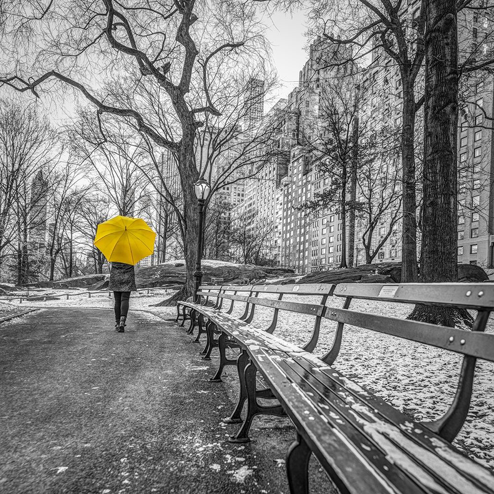 TOURIST ON PATHWAY WITH YELLOW UMBRELLA AT CENTRAL PARK-NEW YORK