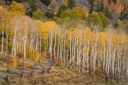 USA-COLORADO-UNCOMPAHGRE NATIONAL FOREST AUTUMN ASPEN TREES AND SPLIT-RAIL FENCE
