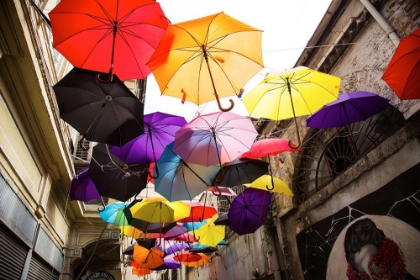 OLD BUILDING AND DECORATIVE UMBRELLAS