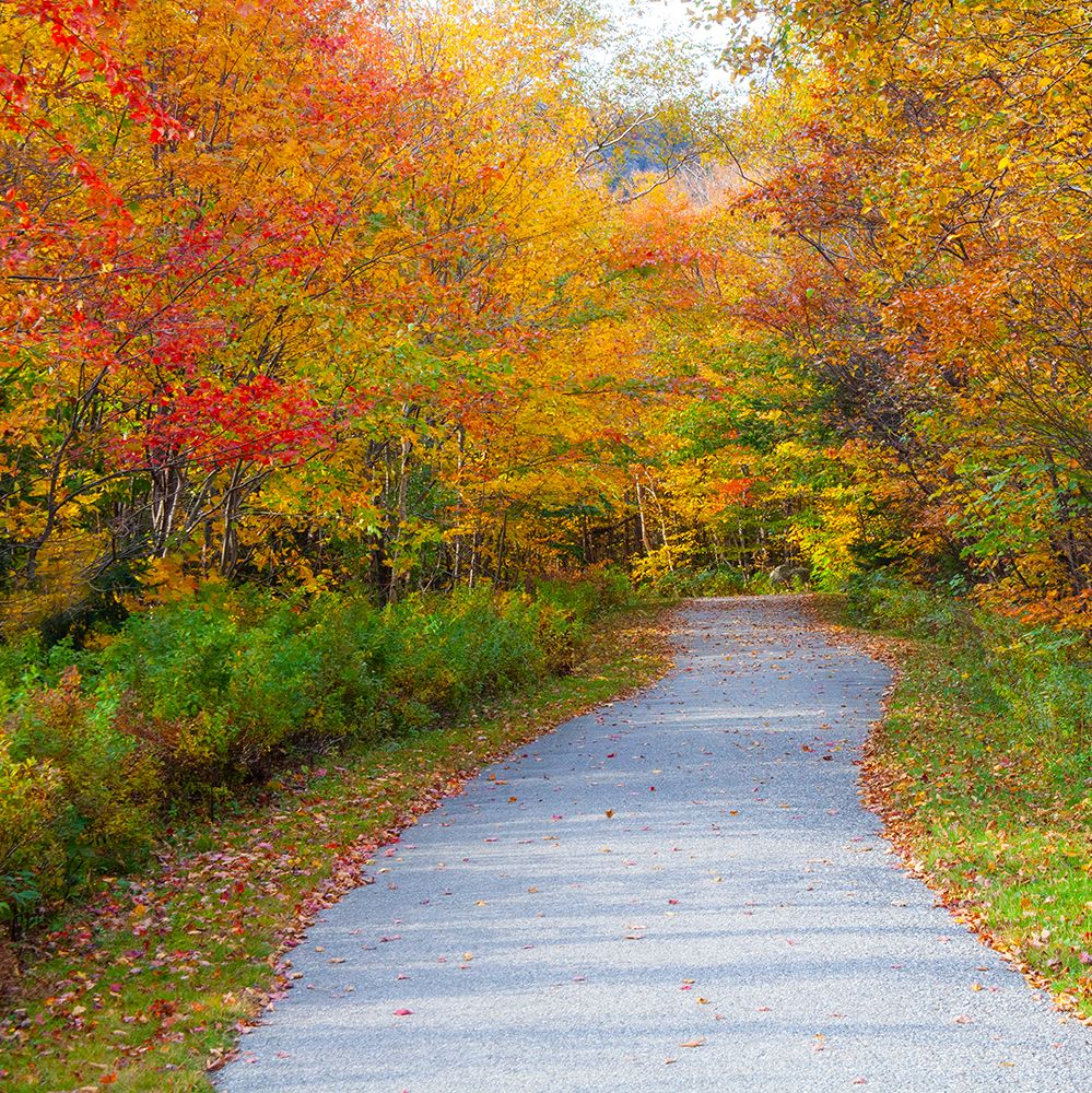 USA-NEW HAMPSHIRE-FRANCONIA-ONE LANE ROADWAY WITH FALLEN AUTUMN LEAVES AND LINED WITH FALL COLORED